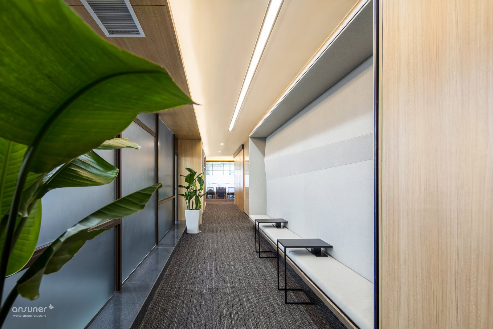 在软装材料的选择上,以具有高级质感的棉麻、PU、绒等面料,配以家具的浅木饰面,结合大理石、陶瓷、水晶以及金属配件营造一种精致大气的商务氛围。一切看似规则,又在规则中不走寻常路。
