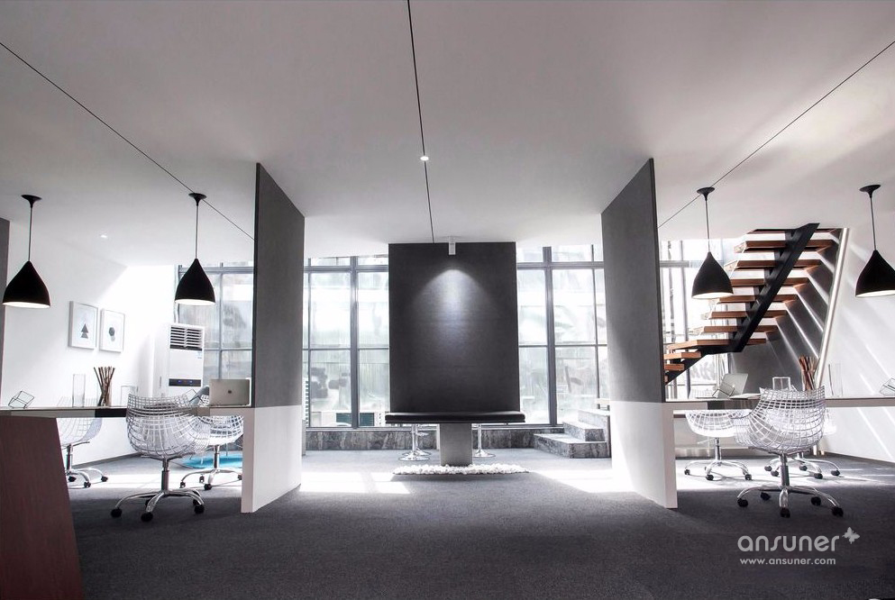 一个属于年轻人创业的工作环境应该具有时尚的气氛,以黑白灰的主色调,充足的阳光,极简洁的风格和活泼的氛围。