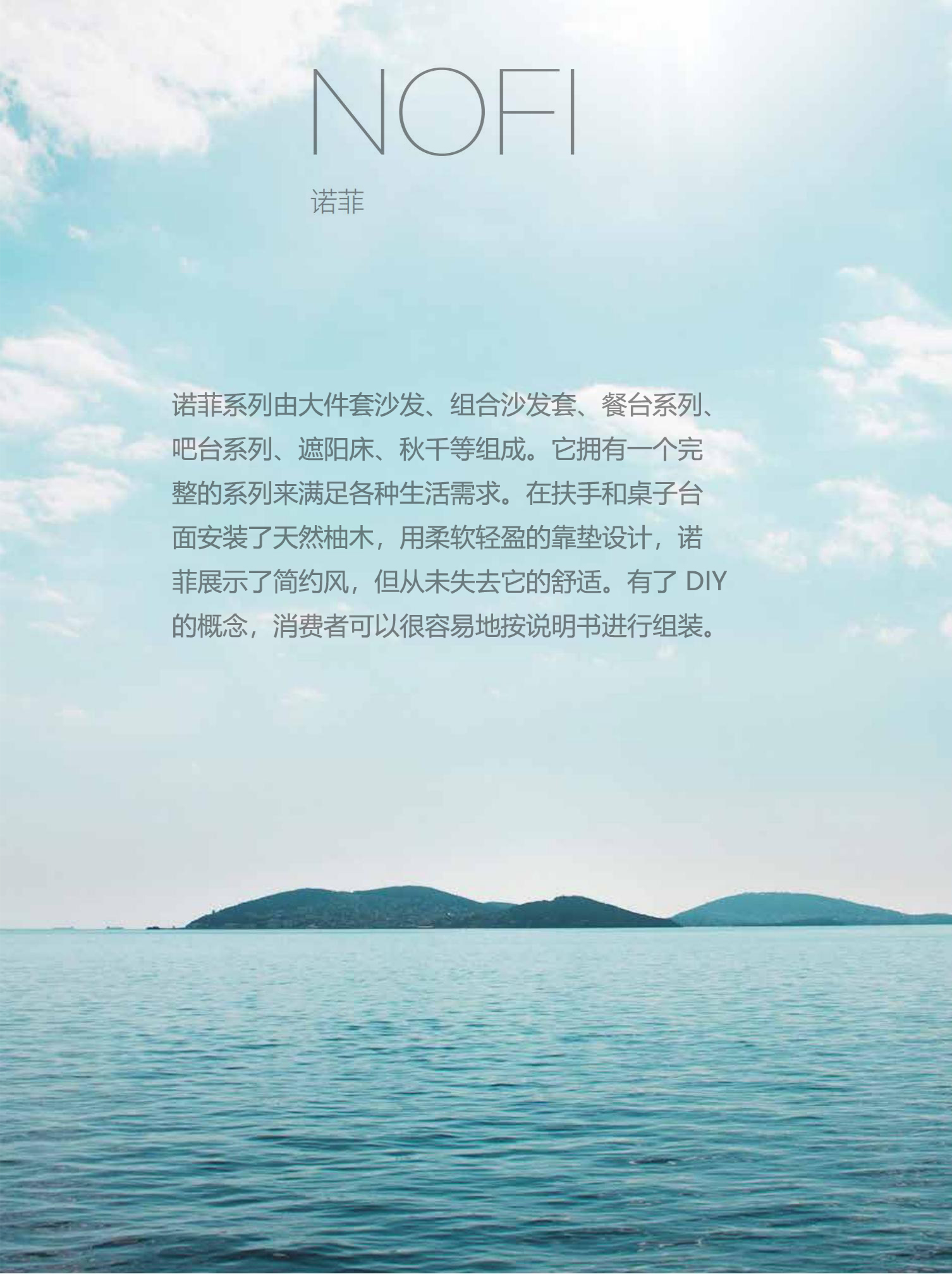 诺菲户外休闲系列由大件套沙发、组合沙发套、餐台系列、吧台系列、遮阳床、秋千等组成。它拥有一个完整的系列来满足各种生活需求。在扶手和桌子台面安装了天然柚木,用柔软轻盈的靠垫设计,诺菲展示了简约风,但从未失去它的舒适。有了 DIY的概念,消费者可以很容易地按说明书进行组装。 【诺菲系列】 “多元”---系列产品配套齐全,沙发、餐桌椅、躺床、高吧餐桌椅、秋千等,满足您的各种生活需求 “DIY”---诺菲全品类产品包装均为拆装,能够最大限度减少装柜空间,同时消费者可参照安装说明书轻松组装产品 “融合”---A级缅甸进口柚木+航空级合金框架+环保布料软包,三者完美融合,简约却不失高级质感